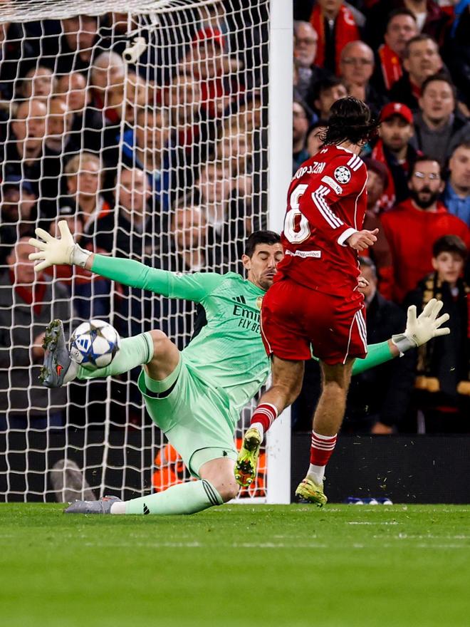 半场比赛结束之前,利物浦球员索博斯洛伊大禁区外远射,库尔图瓦单掌将皮球挡出底线,靠着门将的神勇发挥,皇马艰难带着0-0的比分回到了更衣室。