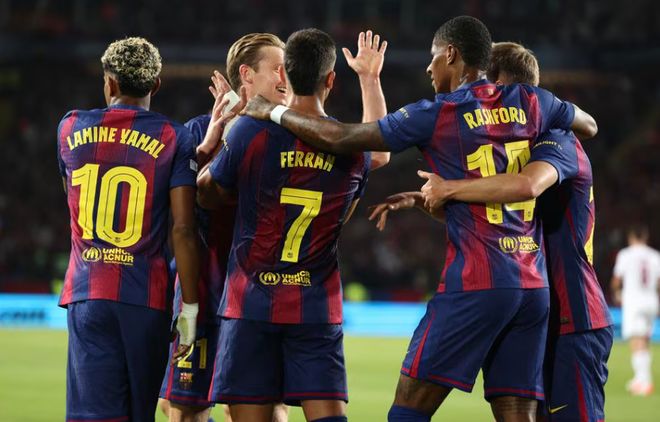 本场比赛,巴萨派出首发的阵容:25-什琴斯尼、3-巴尔德、4-阿劳霍、23-孔德、24-埃里克·加西亚、16-费尔明、17-卡萨多、21-德容、7-费兰、10-亚马尔、14-拉什福德开场不到20分钟,两队打进三球,场面疯狂对攻。
