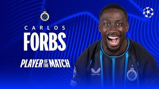 此役主场对阵巴塞罗那,首发出战的卡洛斯-福布斯在上半场助攻队友特雷索尔迪破门,随后自己在上下半场各入一球,上演梅开二度,帮助布鲁日3-3战平对手。最终经过评选,卡洛斯-福布斯当选欧冠官方全场最佳球员。