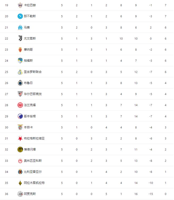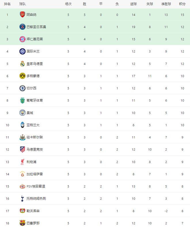 从积分榜来看,阿森纳积15分登上榜首,巴黎升至第二,拜仁、国米分别跌至第三、第四,另外皇马、多特、切尔西、葡萄牙体育同时跻身前八名。此外,穆里尼奥执教的本菲卡,这一轮击败阿贾克斯之后,终结开局4连败,拿到三分之后升至第30位,保留晋级附加赛的希望,阿贾克斯开局5连败继续垫底,距离被淘汰也是时间问题。