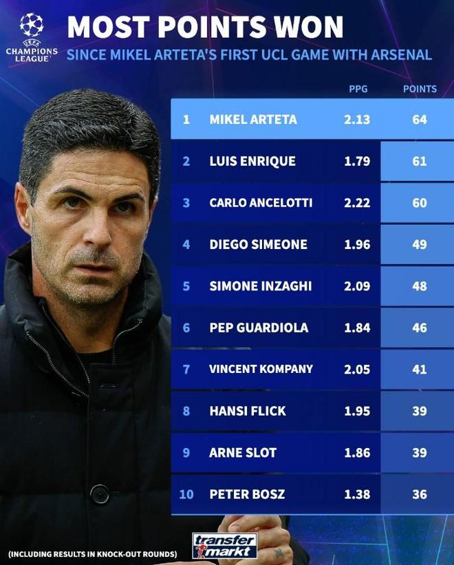 当然,他们的成功可不是偶尔事件,是多个赛季积累下的成就。在本轮欧冠3-0大胜布鲁日豪取6连胜后,阿森纳诸多新人基本上有了发挥证明契机,比如在这轮比赛里发挥出色的马杜埃凯、苏维门迪,及回归的热苏斯,包括之前证实自己埃泽等等,都是新人,这就给他们接下里争夺奖杯打下了基础,可塑人才实在太多了。德转也盘点了自阿尔特塔执教阿森纳欧冠首秀以来,各位主帅在欧冠同期积分榜(包括淘汰赛),在跟诸多名帅对比时阿尔特塔丝毫不吃亏,列第一。他场均2.13分、总分64分分别排名第二、第一,不管是哪个层次来看都是在名帅级别的。在塔帅后包括了安切洛蒂、西蒙尼、小因扎吉、恩里克、瓜帅这样的顶级主帅。由此可见阿尔特塔也许是被低估了的。