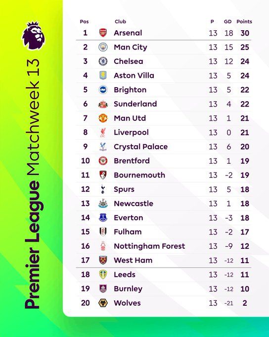 北京时间11月30日22:00,意甲联赛第13轮,比萨主场迎战国际米兰。上半场迪马尔科任意球造险,皮奇尼尼失良机,两队暂0-0战平;下半场恩佐拉失良机,劳塔罗双响,埃斯波西托和巴雷拉分别助攻,最终国米2-0比萨。英超积分榜:阿森纳5分优势领跑最新英超积分形势如图: