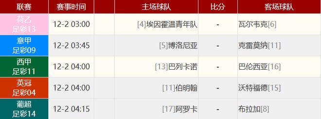 其他赛事比分:英超 诺丁汉森林 0-2 布莱顿英超 阿斯顿维拉 1-0 狼队西甲 皇家社会 2-3 比利亚雷亚尔西甲 塞维利亚 0-2 皇家贝蒂斯西甲 塞尔塔 0-1 西班牙人意甲 莱切 2-1 都灵意甲 亚特兰大 2-0 佛罗伦萨德甲 汉堡 2-1 斯图加特德甲 法兰克福 1-1 沃尔夫斯堡德甲 弗赖堡 4-0 美因茨法甲 斯特拉斯堡 1-2 布雷斯特法甲 昂热 1-2 朗斯法甲 勒阿弗尔 0-1 里尔法甲 洛里昂 3-1 尼斯法甲 里昂 3-0 南特