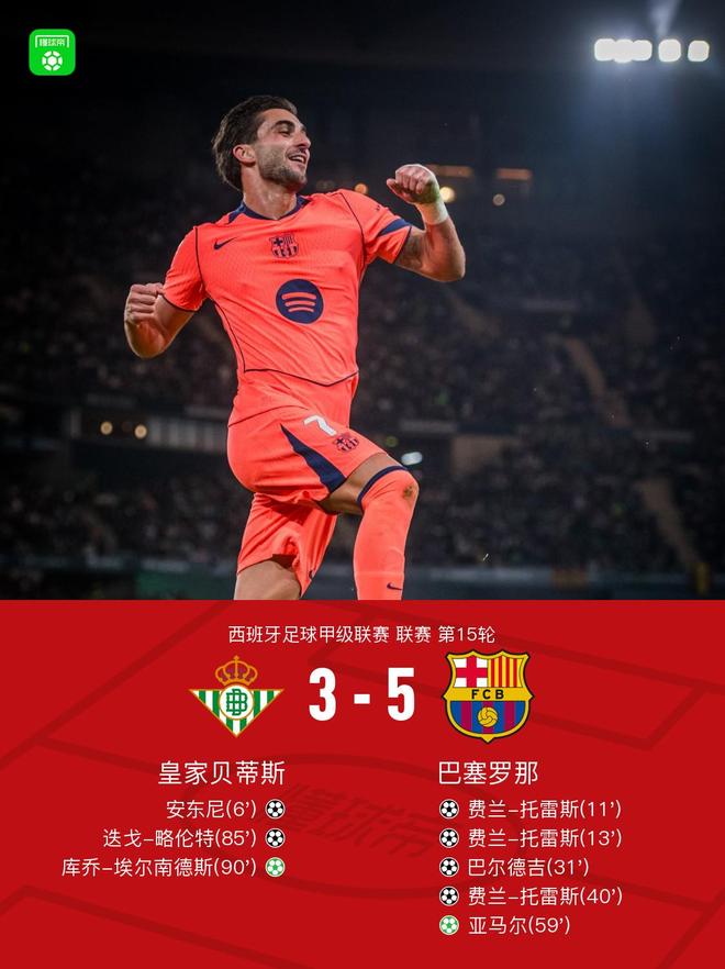 北京时间12月7日西班牙足球甲级联赛第15轮,皇家贝蒂斯主场对阵巴塞罗那。上半场,安东尼率先破门。随后,费兰双响帮助巴萨反超比分。佩德里传球,巴尔德吉劲射得分。佩德里助攻,费兰远射半场成功戴帽。下半场,红蓝军团获得点球机会,亚马尔主罚命中。比赛最后时刻,迭戈-略伦特和库乔为贝蒂斯扳回两城。全场比赛结束,巴萨5-3击败贝蒂斯,迎来西甲6连胜,继续占据榜首位置。关键事件