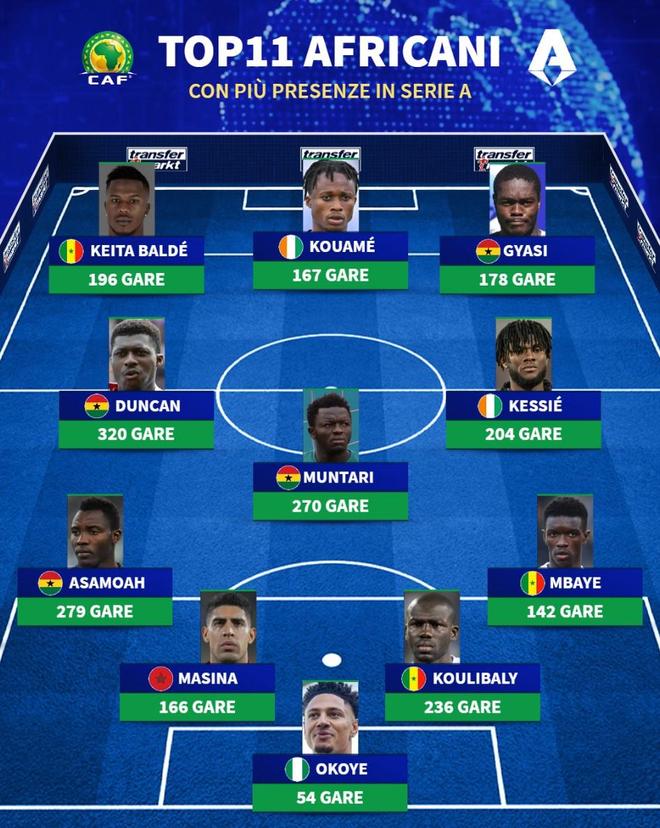 德转列意甲出场数最多的非洲球员11人阵容:门将奥科耶(尼日利亚)54场后卫易卜拉希马-姆巴耶(塞内加尔)142场、库利巴利(塞内加尔)236场、马西纳(摩洛哥)166场、阿萨莫阿(加纳)279场中场凯西(科特迪瓦)204场、蒙塔里(加纳)270场、艾尔弗雷德-邓肯(加纳)320场前锋焦希(加纳)178场、夸梅(科特迪瓦)167场、凯塔-巴尔德(塞内加尔)196场
