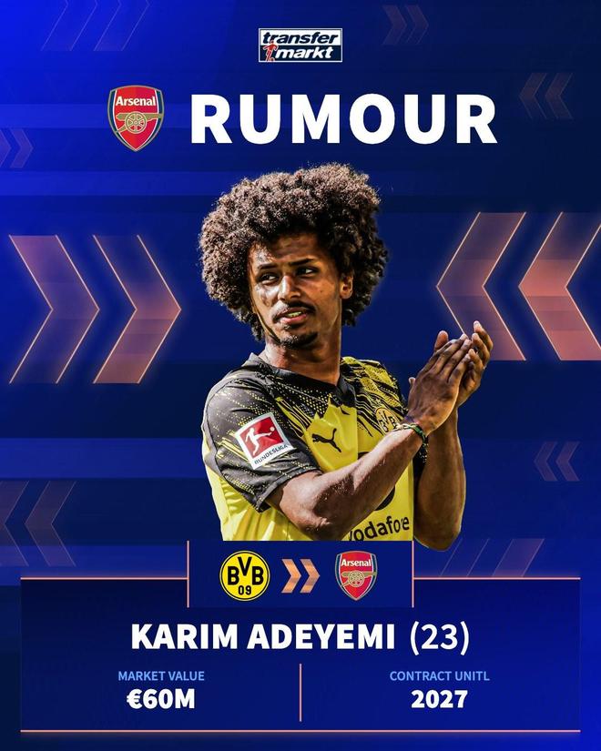 德转:阿森纳考虑明夏追阿德耶米,多特或面临出售球员的压力
