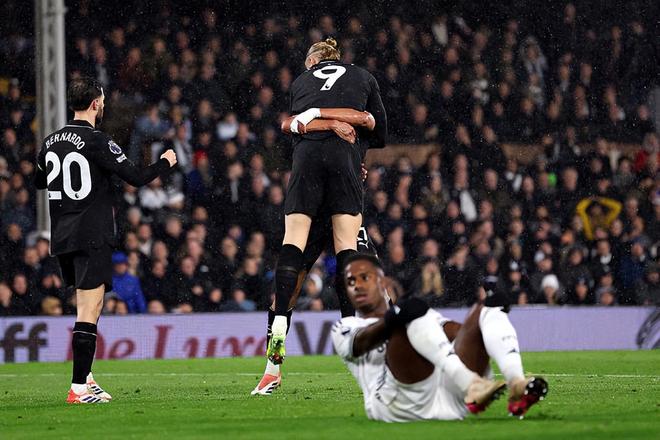 上轮联赛凭借福登的梅开二度和补时阶段的绝杀,曼城得以绝杀利兹联,从而终结了2连败;同时随着阿森纳被切尔西逼平,蓝月亮排名也回到英超第二的位置。本周中英超进行一周双赛,曼城率先出战客战富勒姆;福登连场双响,哈兰德百球里程碑;曼城在领先4球情况下险些被逼平,最终是5:4惊险客场取胜。富勒姆虽然只排在积分榜第15,但过去2轮分别击败了黑马桑德兰和热刺;瓜迪奥拉沿用了上场比赛的首发阵容,福登、多库、哈兰德组成进攻线;B席、尼科-冈萨雷斯、赖因德斯搭档中场组合;努内斯、迪亚斯、格瓦迪奥尔、奥赖利后防线上一字排开,多纳鲁马镇守球门。比赛开打后,曼城立马展开攻势,第6分钟,福登推进传球,哈兰德停球低射击中立柱弹出!第17分钟,曼城左路肋部进行了一次耐心的传递之后,多库果断选择传中,赖因德斯前点一漏,哈兰德点球点迎球扫射破门,1:0!哈兰德不仅打破3场比赛的进球荒,同时打进了个人英超第100球,这是英超历史上第35位跻身百球俱乐部的球员;111场100球也是英超联赛历史最快100球。第23分钟,巴锡左路斜传,史密斯-罗禁区内潇洒转身接球低射,多纳鲁马下地反应迅速力保球门不失;第37分钟,哈兰德回撤背身接球直传,赖因德斯后插上反越位面对出击的莱诺挑传得手,2:0!在首轮对阵狼队打进第一粒英超入球后,赖因德斯终于是攻入了第2粒进球。第44分钟,赖因德斯开出角球,莱诺将球勉强击出,福登禁区外围无人盯防兜射直接命中球门上角,3:0!半场结束前,同样是利用一次角球机会,巴锡二次进攻直塞,哈里-威尔逊右路立马传中,史密斯-罗前点冲顶头球顶入远角,多纳鲁马望球兴叹,3:1!下半场会回来第48分钟,曼城打出快速反击,多库左路突破推进后斜塞禁区,哈兰德前点脚后跟嗑球,福登后点劲射再进一球,4:1!2轮联赛下来福登打进4球,似乎有些找回了上上赛季英超MVP的状态。第54分钟,多库前场左路积极反抢后内切兜射,皮球划出一道弧线兜射,皮球打在贝格身上产生折射,莱诺毫无办法,5:1!虽然落后的比分较大,但富勒姆随之展开反扑,第57分钟,富勒姆右路传中被破坏,伊沃比弧顶处打出一脚漂亮的推杆死角,多纳鲁马同样鞭长莫及,5:2!第69分钟,刚刚被换上了萨维尼奥左路下底传中,哈兰德后点力压后卫头球攻门,皮球第二次打在了门框上;第72分钟,史密斯-罗右路直传,卡斯塔涅跟进倒三角被破坏,丘库埃泽迎球爆缸入网再追一球,5:3!第78分钟,富勒姆角球进攻,曼城又在二点当中无人盯防,丘库埃泽如法炮制迎球抽射上演梅开二度,5:4!曼城21分钟时间连丢3球。好在余下的时间曼城还是顶住了对手的压制,最终5:4带走了胜利;目前曼城多赛1场后,距离阿森纳只剩下2分的差距了。