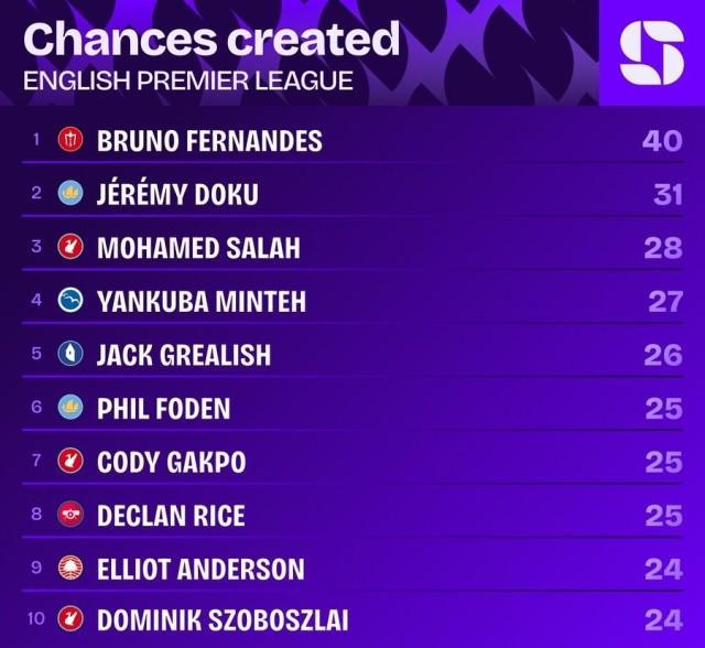 英超的角球失球数超过曼联(15)。 【40】B费是本赛季