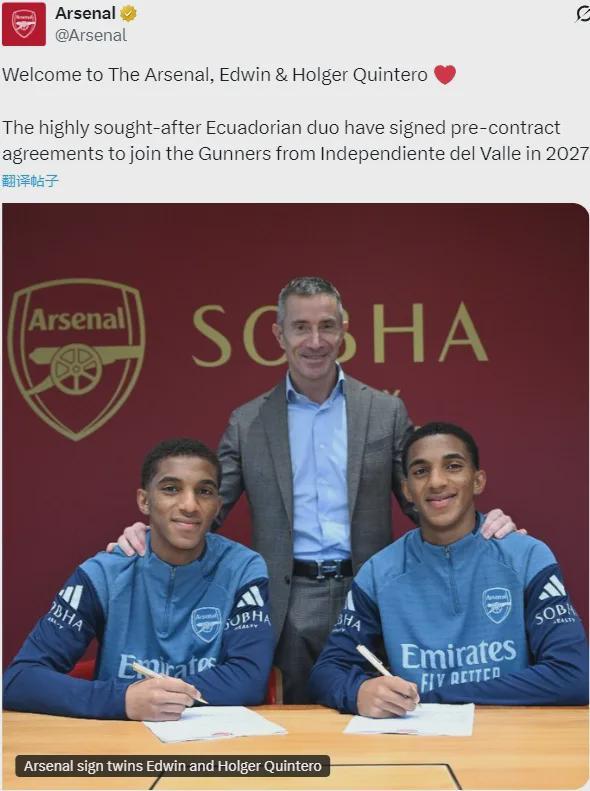 官方:阿森纳宣布和厄瓜多尔球队山谷独立就16岁双胞胎兄弟埃德温-金特罗和霍尔格-金特罗的转会达成了协议,2人将在2027年夏天年满18周岁后正式加盟。金特罗兄弟和因卡皮耶出生在厄瓜多尔的同一地区,并且都出自山谷独立队的青训,他们被认为是南美最令人激动的新星之一,并且已经是厄瓜多尔u17的成员,其中埃德温是一名左脚右边锋,而霍尔格是右脚攻击型中场。着实没想到这么快就官宣了,不像阿森纳的风格,而且一般青年球员签约是阿森纳青年队的官推官宣,但这次直接用了官推!还有贝尔塔亲临,很有牌面!BBC说打包价900万英镑,很合适!期待住吧,2年后见!其实根据一些报道,阿森纳接下来不会再那么疯狂砸钱了,会投资年轻人,我觉得这也正常,而且健康,你不可能年年花两三亿……