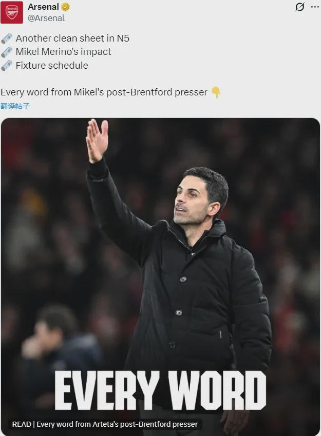 阿尔特塔出席了赛后新闻发布会,我们来看看阿森纳主帅的发言。关于首发阵容轮换:轮休,这是个很积极的用词。我们不得不做出一些改变,因为从各个角度来讲,我们都度过了要求很高的一周,无论是情绪还是身体上,还有战术和技术层面,而且我们比布伦特福德少休息一天。但我们在对阵这样一支组织有序的球队时依然拿出了这种表现,他们很清楚如何创造自己的机会,并且非常擅长,因此1-0的时候球队知道这是不够的。不过除了那个角球,我不认为球队给对手提供了任何机会。谈谈伤病问题吧:是的,显然这不是好消息。赖斯不得不下场,我们还不知道情况,必须等到明天看看他究竟是怎么回事。莫斯克拉也因伤下场,而且我们还有加布里埃尔和萨利巴缺阵,所以我们必须适应这点,这也是本赛季的主题之一。但当我看到那些本赛季没有踢很多比赛的球员时,比如怀特,还有厄德高,他直接出战了96分钟,马杜埃凯也一样……哲凯赖什也替补登场,他也开始得到一些时间,所以我很高兴看到这点。莫斯克拉什么情况?我们必须等等看,也许是脚踝或者膝盖的问题,我们还不知道。他无法告诉我们具体是哪里,但莫斯克拉当时无法继续比赛。谈谈梅里诺在球队的角色吧:我之前就说过,他有好奇心,并且愿意学习,愿意帮助球队。梅里诺知道我们从赛季开始就遇到了严重的问题,我们失去了哈弗茨、热苏斯还有哲凯赖什,所以球队需要解决方案,而梅里诺最近一年的表现非常好。我认为本赛季梅里诺又精进了一层,因为他能做更多事情了,所以我觉得球队真的很感谢他,他也非常享受这点。你对赛程安排有什么看法?我们可以帮助球员和所有人,多休息一天吧,尤其是那些参加欧战的球队。我认为我们可以做到,因为我们都会受益。我们从来没见过这样的赛程安排,不仅是英超,而是所有的赛事。所以我们必须努力做出改变,我认为这是常识。在某一刻,我认为比赛变得太多了,而球员们不是机器。以上是赛后新闻发布会。塔子对首发做出了三处调整,厄德高、马杜埃凯和怀特首发,我觉得算是合理的,再怎么说这也是联赛,能轮换几个是几个。最近比赛强度这么大,其实最近的成绩已经相当好了,看看竞争对手们,几乎都在丢分。而且阿森纳的对手还都很强。伤病的话,赖斯反而感觉没什么问题,莫斯克拉暂时不敢说,如果是脚踝和膝盖的话,那够呛能赶上踢维拉,如果是其他问题可能休息几天还好。但只要不是长期伤病就好。梅里诺确实值得称赞,临危受命,在哈弗茨今年长期缺阵的情况下,不仅解决了锋线难题,甚至可以说还有一定程度的提升。他争抢头球方面非常有心得,而且越来越有中锋的支点和串联作用,几次做球相当好。今年能争冠,上赛季能保住不崩,绝对有梅里诺很大的功劳。说心里话我个人其实并不喜欢梅里诺和这支球队的球风(又不是以个人喜好为转移的,再说成绩压倒一切),但不影响给予很高评价,这就是阿森纳过去害怕的样子。至于赛程,讲道理阿尔特塔说得不错,如今比赛安排的太多了,其实哪支球队都是一堆伤病,确实应该改变。但如果不能改变,那就要自己改变……至少阿森纳是目前阵容厚度冠绝英超甚至欧陆的豪门,这点阿尔特塔已经比绝大多数主帅幸福了。来看其他消息吧。