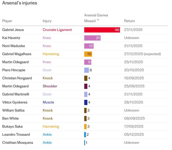 英超15轮后,阿森纳一线队的25名球员里,有17人本赛季因伤或因病缺席过至少一场比赛。且伤病集中在同一位置(如4名中卫、3名前锋缺阵),《每日电讯报》指出,阿森纳的伤病源于替补球员负荷激增、赛程密集导致训练不足、战术对爆发力的依赖等,也存在比赛意外因素。英超联赛战罢15轮,目前来看似乎只有两件事能阻止阿森纳时隔二十余年重夺联赛冠军。第一大阻碍是曼城由进球机器埃尔林-哈兰德领衔的锋线。第二大阻碍则源自球队内部:一线队球员接连不断的伤病潮。阿森纳组建了一套阵容深度和身价均位居世界前列的球队,但即便有如此周密的规划与投入,层出不穷的伤病问题还是让米克尔-阿尔特塔头疼不已。这位阿森纳主帅近来正绞尽脑汁,为球队的伤病难题寻找一些无奈且非常规的应对之策。比如在近几周,他不得不让司职中场的米克尔-梅里诺客串应急前锋。在欧冠对阵布鲁日的比赛中,阿尔特塔又启用了另一名中场克里斯蒂安-诺尔高临时客串中卫。这就像一场永无止境的打地鼠游戏:刚有一名球员伤愈归队,就又有另一名球员倒下。阿森纳一线队的25名球员里,有17人本赛季因伤或因病缺席过至少一场比赛。本赛季英超所有球队中,只有利兹联的伤病情况比阿森纳更为严重。这些数字直观地反映出球队的困境,但这还只是冰山一角。更关键的问题在于,阿森纳的伤病总是集中在同一位置。阿森纳的阵容深度本足以轻松应对同时折损一名前锋、一名中场和一名后卫的情况。这种程度的伤病并不会让阿尔特塔夜不能寐。但如果同时伤缺三名前锋,或是像目前这样折损四名中卫,那无疑会成为巨大的挑战。为什么会出现这种情况?阿森纳又能做些什么来解决?从肌肉伤病的宏观层面来看,除了减少球队的比赛场次之外,并没有简单的解决办法,而比赛场次短期内显然不会减少。如果阿森纳内部能掌控简单的解决方案,那么由经验丰富的扎夫-伊克巴尔博士带领的医疗团队,早就该解决这个问题了。扎夫-伊克巴尔博士曾在水晶宫、利物浦和托特纳姆热刺任职。这个问题在上赛季就已经拖累了球队的争冠进程。不过,同一位置球员集中受伤的原因显而易见:当一名球员伤停后,他的替代者就要承担更大的身体负荷。以维克托-哲凯赖什为例,由于加布里埃尔-热苏斯和凯-哈弗茨伤缺,他成为了队内唯一健康的中锋,在赛季前15轮联赛中首发了13次。因此,当哲凯赖什在11月遭遇肌肉伤病时,这一结果其实并不令人意外。无独有偶,在中卫加布里埃尔-马加良斯因国家队赛事受伤后,威廉-萨利巴、克里斯蒂安-莫斯克拉和尤里恩-廷贝尔也相继出现了不同程度的伤病。这绝非巧合。“当球队不断有球员伤停,其他球员身上的负荷就会不断加重。”阿尔特塔在本周表示,“这样一来,球队就陷入了一个非常危险的恶性循环。”不满的球迷质疑,阿尔特塔以高强度、高要求著称的训练课是否是导致伤病频发的原因。这位阿森纳主帅对此不屑一顾,他在本周早些时候表示,密集的赛程意味着球队根本没有充足的时间进行系统训练。事实上,教练组的观点并非是阿森纳训练强度过高或频率过密,而是球队的训练时间严重不足。肌腱在经历高强度比赛后需要72小时的恢复时间,而阿森纳几乎每周中都有比赛任务。因此在整个赛季中,阿森纳球员很少有机会通过训练来增强肌肉和肌腱力量。他们不断重复着比赛、短暂恢复、再比赛的循环。正如球迷所期望的那样,阿森纳已经对肌肉伤病问题进行了深入研究。研究发现,球员在全力冲刺加速时,往往是伤病的高发时刻。由于赛程过于密集,参加欧战的俱乐部无法在球员尚未从之前的比赛中恢复时,通过训练让他们持续承受这种生物力学负荷。换句话说,比赛所要求的身体强度,是球员在训练场的恢复训练中无法模拟的。伤病问题的出现,也存在一定的运气成分。阿森纳本赛季的诸多伤病,都是由比赛中难以预料的突发情况导致的。单是马丁-厄德高一人,本赛季就遭遇了三次对抗性伤病。凯-哈弗茨和马克斯-道曼也都在与对手的拼抢中受伤。莫斯克拉的伤病源于落地时姿势不当,而廷伯则是因为在对阵阿斯顿维拉的比赛中被踢伤,从而缺席了对阵布鲁日的欧冠赛事。显然,这些伤病并非由训练方法不当造成。阿尔特塔的战术打法是否也是诱因之一?在他的战术体系中,后卫需要采用高位防线,因此需要覆盖更大的防守空间。边锋需要高速冲击对方边后卫,而前锋则要通过积极逼抢引领全队的压迫节奏。本赛季,恰恰是中卫和前锋位置的球员受伤最多,踢法相对不那么依赖爆发力的中场球员则更“安全”。另一个值得玩味的因素是,阿森纳在引援时,特意挑选那些职业生涯出勤率较高的球员。球队在考察引援目标时,球员的身体耐用性是重要的考量指标。但这一策略也可能存在潜在弊端:这类球员在加盟阿森纳时,往往已经有了相当可观的比赛累积出场时间。经过多年的征战,是否会存在累积疲劳的风险,进而导致受伤概率上升?这种可能性无疑是存在的。所有这些疑问和推测都印证了一个基本事实:想要准确预判伤病发生的时间和方式,实际上是不可能的。对于阿森纳而言,他们只能寄望于当前的“危险循环”能尽快终结,从而让阿尔特塔可以合理轮换阵容、保护球员,并充分发挥球队的阵容深度优势。加布里埃尔-热苏斯在因伤缺阵11个月
