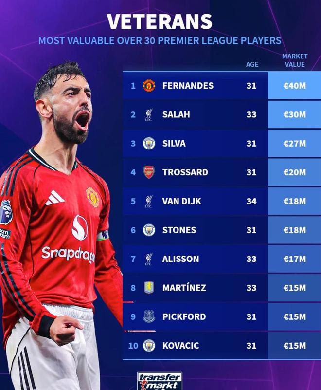 德转列英超30岁以上球员身价TOP10:1. 布鲁诺-费尔南德斯(曼联) 31岁 4000万欧元2. 萨拉赫(利物浦) 33岁 3000万欧元3. 伯纳多-席尔瓦(曼城) 31岁 2700万欧元4. 特罗萨德(阿森纳) 31岁 2000万欧元5. 范戴克(利物浦) 34岁 1800万欧元6. 斯通斯(曼城) 34岁 1800万欧元7. 阿利松(利物浦) 33岁 1700万欧元8. 达米安-马丁内斯(阿斯顿维拉) 33岁 1500万欧元9. 皮克福德(埃弗顿) 31岁 1500万欧元10. 科瓦契奇(曼城) 31岁 1500万欧元【上咪咕独家看英超】