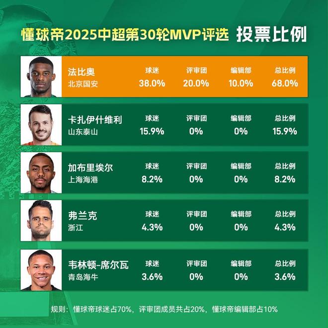 在中超第30轮北京国安主场5-1击败梅州客家的比赛中,法比奥先是接柏杨传中头球首开记录,又接王刚传中头球扩大比分;下半场张稀哲的传中帮助法比奥面对半空门完成帽子戏法,比赛临近结束法比奥在禁区内凭借个人能力穿郭全博小门实现大四喜。正是最后一粒进球,帮助法比奥在一场隔空的“京鲁德比”中以一球之差击败卡扎伊什维利,收下2025中超赛季金靴。最终,综合球迷投票、评审团投票、编辑部投票三部分,法比奥以68%的得票率,大幅领先其他候选,当选中超第30轮MVP。法比奥精彩表现第9分钟,法比奥头球先入一球,但因越位在先,经VAR确认后进球无效。